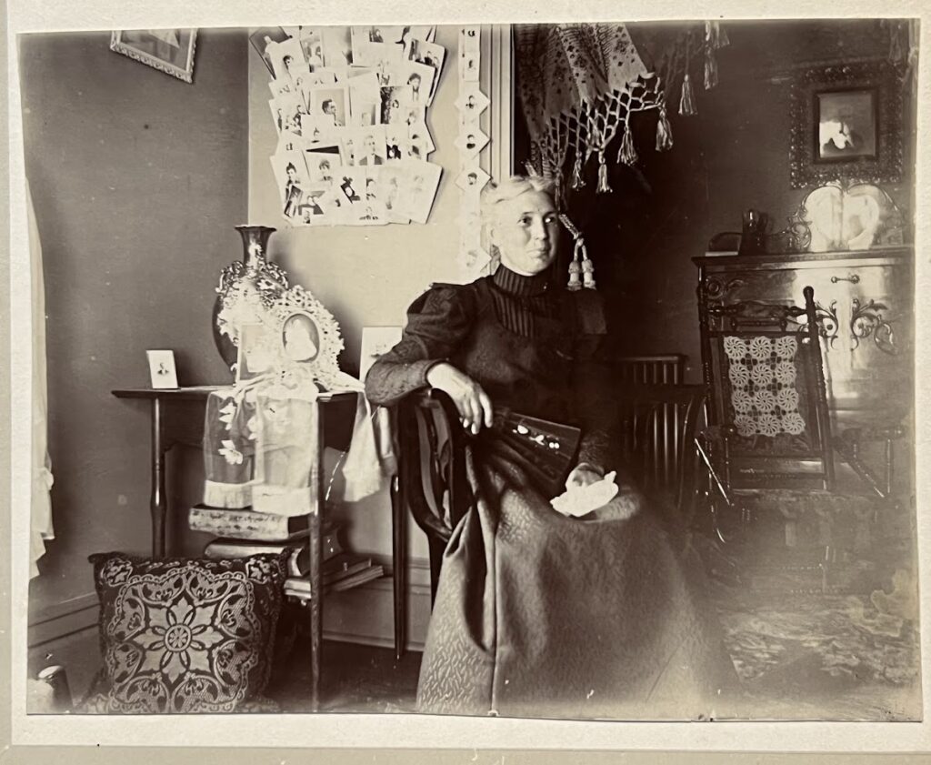 This photo of Sarah was taken at their home in Rockford Township around 1900. Take a moment to notice the wonderful collage of photographs displayed on the wall behind her — a glimpse into the family’s life and the era they lived in.